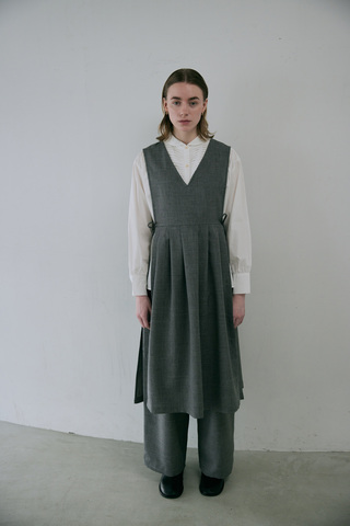 ウールトロのような上品な落ち感と軽やかさを併せ持つ、程よくモードな雰囲気のポリエステル素材を使用したベストワンピース。袖にボリュームのあるブラウスを重ねれば、特別なシーンにも映える着こなしに。シンプルながらもアレンジ自在で、日常からオケージョンまで幅広く活躍する一枚です