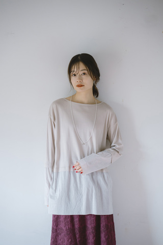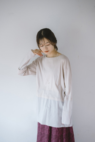 袖と本体の切り替え部分には、程よい透け感とナチュラルなハリ感の ローン素材 を組み合わせることで、裾からチラリと覗くデザインが旬のこなれ感を演出。少し長めの着丈に仕上げており、ボトムスにインせずそのまま着てもバランスよく決まります。
