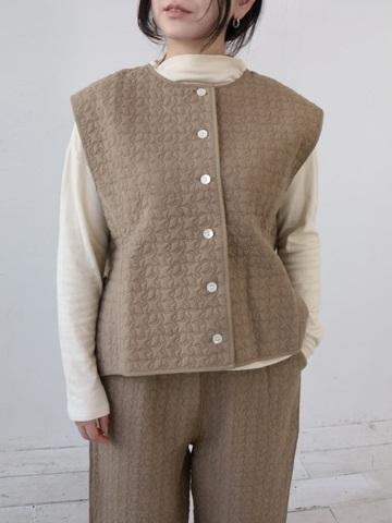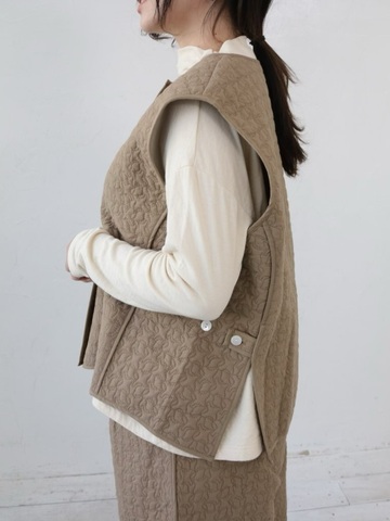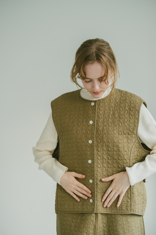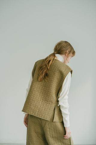 滑らかなコットンサテンの表地と、柔らかなボイル素材の裏地を組み合わせたキルティング生地で仕立てたベスト。軽くてあたたかく、重ね着のアクセントとしても活躍します。