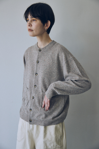 シンプルなカーディガンも控え目に散らばるカラーネップがナチュラル感と程よくアクセントに。