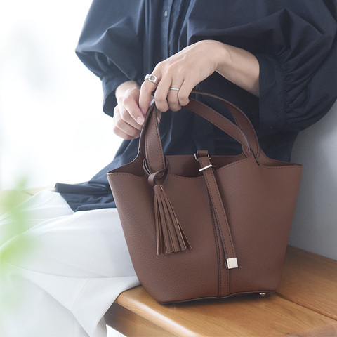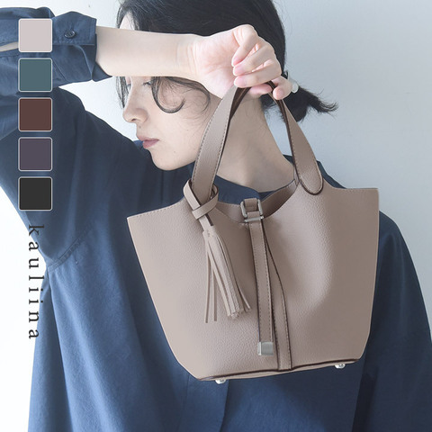 そんな想いから登場した、フェイクレザーのミニトートです。キチンと感もありつつ、使いやすさも備えたデザイン。シルバーの金具やタッセルで上品さを添えています。