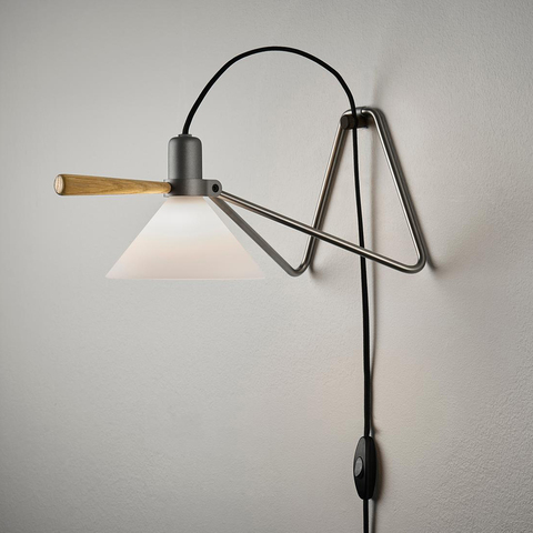 SPOTの個性のひとつになっているのが、この木製ハンドル。イメージの源となったのは、エスプレッソマシンのハンドルなのだそう。光源の角度を調整するときの取っ手としての機能も兼ね備えており、LE KLINTらしい「用の美」を体現しています。