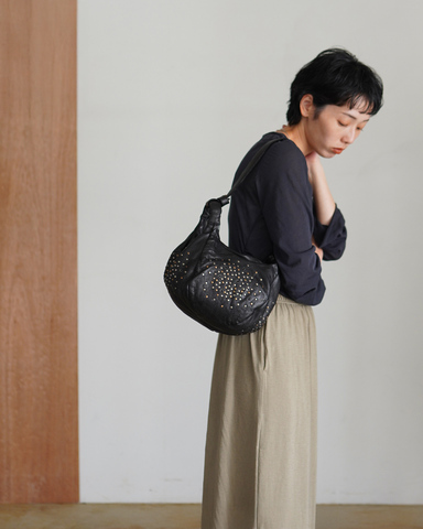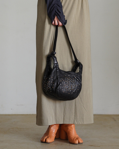 バッグ全体に散りばめられたスタッズが目を引く、存在感のあるデザイン。小ぶりながらカジュアルからきれいめまで幅広いスタイルに馴染むハンドバッグです。