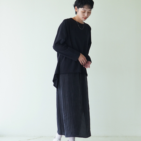 トップス部分には伸縮性のあるカットソー素材を採用し、スカート部分にはほんのり起毛感のあるピーチ素材を組み合わせることで、異素材ならではの表情豊かな仕上がりに。