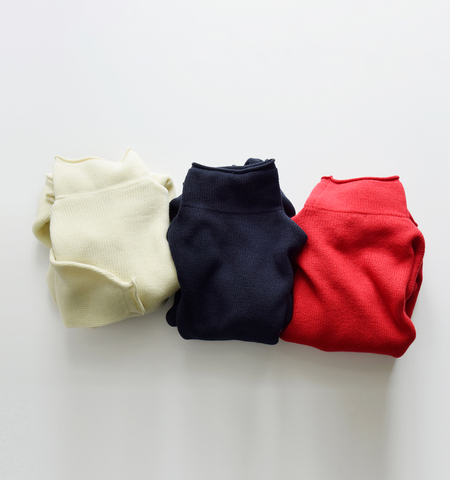 ゆったりとしたモックネック。高さがあり、ネックを折らずに着てもゆるっとした撓みが出来て、ラフで可愛らしい形になります。