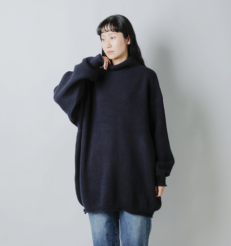 ふっくらとした肉感のある畦編みニットを使用。丁寧に編まれており、美しい凹凸感と豊かな表情が魅力です。長めの丈でゆったりとしたサイジングが、リラクシンな着こなしに。ネックや裾のくるんとなった表情が可愛らしいポイントになっています。