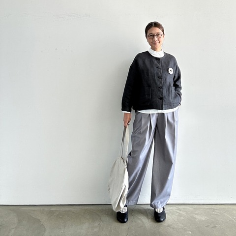 HACHITENのロングセラー「きちんと見えのワンピース」と同じ素材を使ってるんです。あの生地はお気に入り。だから今度はパンツで作ってもらいました。ほどよい落ち感と、ほんのり上品な光沢感が「ちゃんとしてる」って雰囲気を醸しだす。子どもの学校行事や、急なお呼ばれにもこれ履いておけば大丈夫。