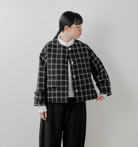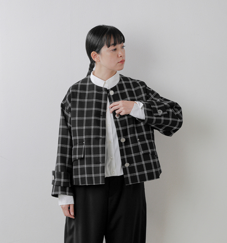 ソフトツイード素材を使用し、ブルゾン感覚で羽織れるスタイリングの幅の広い一着。ドライタッチの太番手100%ウールのブラックウォッチ。甘く織り上げられ、独特なドレープ感が特徴。