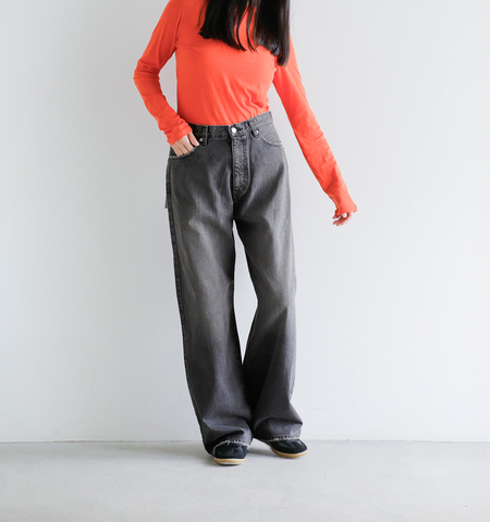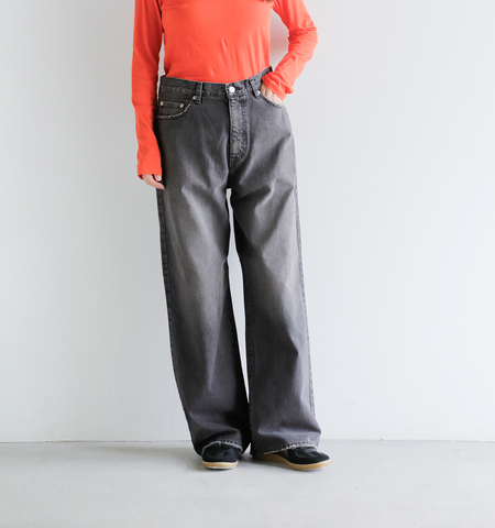 12ozストレートデニムを使用したワイドテーパードシルエットで、ゆったりとしながらもスタイルをよく見せる美しい縦ラインを実現。経糸・緯糸ともに黒で織り上げたBLACK DENIMを採用し、濃淡のはっきりとした色落ちと立体感のあるエイジングを楽しめる一本です。ヴィンテージ感のある仕上がりが魅力で、穿き込むほどにさらに風合いが増していきます。年齢や性別を問わず合わせやすいシルエットで、カジュアルからモードまで幅広いスタイリングに活躍するデニムジーンズです。