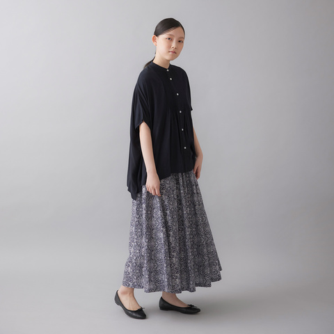 詰まり気味の襟元がきちんと感を添え、ゆったりシルエットも上品に。