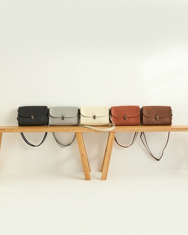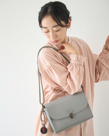横長のかたちと、アンティークのようなくすんだゴールドの差し込み金具の組み合わせが、レトロな雰囲気。高級感のあるシンプルなデザインで、おとなナチュラルな服装やリネン、コットンなどのやわらかい素材にもよく合います。防水レザーを使っているので実用性も◎