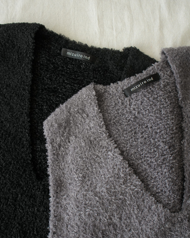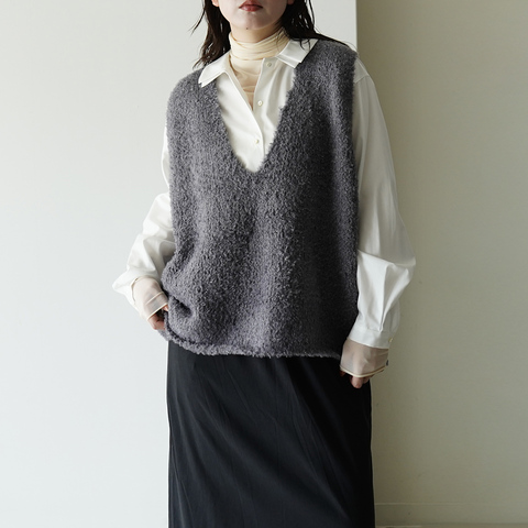ふわふわとしたループ編みが印象的なへアリーヤーンベスト。深めのVネックが顔まわりをすっきりと見せ、シャツやタートルネックとの重ね着を楽しめます。