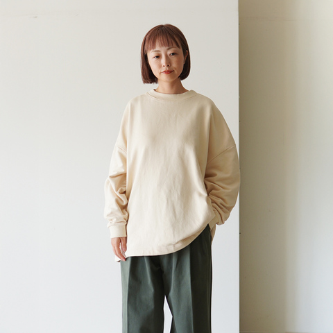 ゆったりとしたワイドシルエットとドロップショルダーが魅力の長袖トレーナー。程よく開いたネックラインは首元をすっきりと見せ、シンプルながら大人の女性に似合う一枚です。