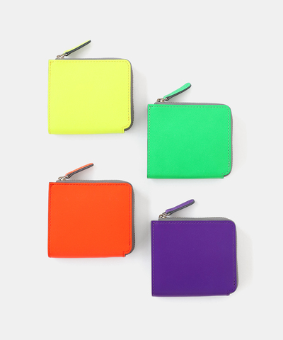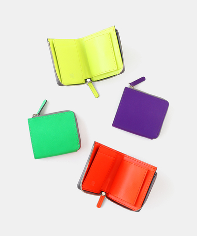 鮮やかなネオンカラーが映える、牛革素材の二つ折りミニウォレット