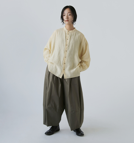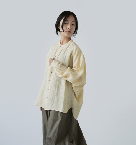 ネップ感のある麻糸を甘く織り上げた軽い生地感です。ハリ感がありながらもソフトな風合いも感じられ、かさっとした乾いた質感となっています。淡色は透け感がありますので、インナーを合わせてのご着用をお薦めします。