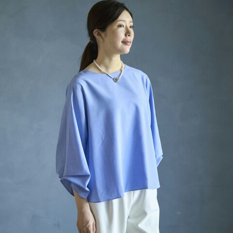 お盆を過ぎても、まだ気温も湿度も高い季節を快適に過ごす為の服を、Kilka(キルカ)で作りました。天然素材のようなシャリ感がありつつ、吸水・速乾性が高く、UVカットもしてくれて、さらにシワになりにくいという機能性の高い万能生地は品のいいとろみを生みだします。それを生かしたタックを入れた7分袖のブラウスは、寒暖差にもしっかり対応。晩夏からのきれいめコーディネートの担い手となってくれる一着です。