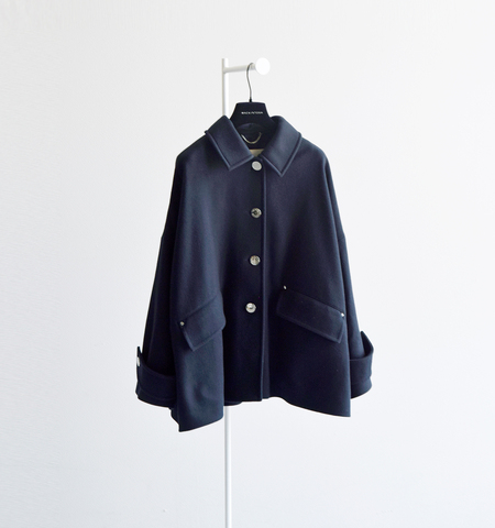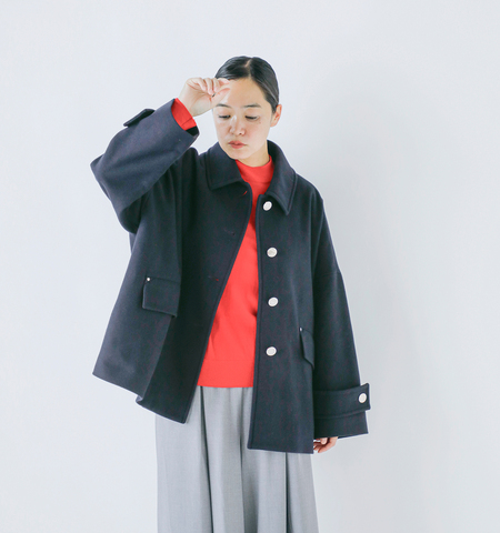 ドロップショルダーのショート丈コート。HUMBIEのオーバーサイズのAラインワイドシルエットはそのままに、軽快さが感じられる丈感が新しい。