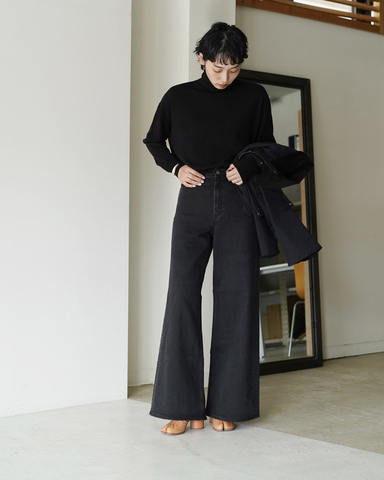 コンパクトなハイネックをタックイン、主役のワイドフレアで下にボリュームをもたせ、黒でまとめて縦のラインを際立たせています。手持ちのライトアウターが動きを添え、現代的なスマートさに。