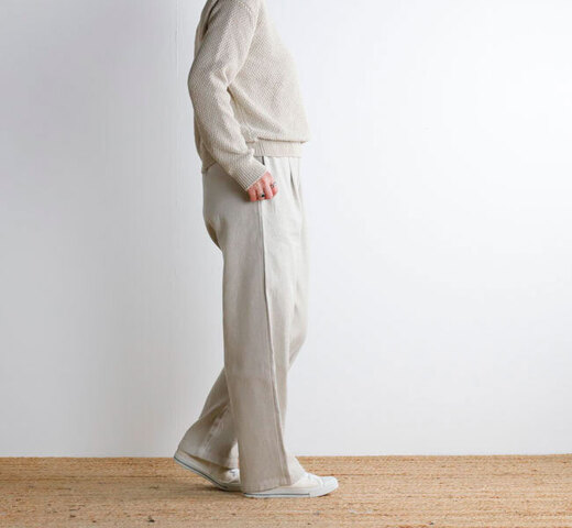 経にリネン、緯に自然なムラのあるコットンを使用し、2本ずつそろえて綾織りに織り上げています。厚みの出るようしっかりと織られた生地は、単色ながらもカラーに奥行きを感じます。コーディネートを仕上げるロングベストや、寒さを感じる季節から取り入れられるベーシックなパンツです。