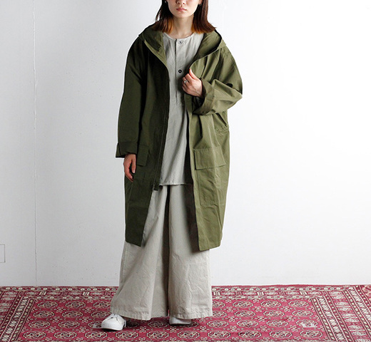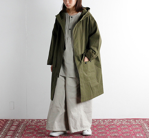 HTS(HARROW TOWN STORES) より、イタリアの老舗ファブリックメーカーのコットンナイロン素材を使用したフードコートの登場です。 コットンのさらりとした肌触りと柔らかくマットな質感。 そして、ナイロンの軽さと耐久性。 それぞれの性質を兼ね備えたコットンナイロン生地を使用。 また、ナイロンによる独特のハリ感や、タフな素材感は、ワークウェアらしい雰囲気を感じさせてくれます。 裏無しの一枚仕立てのコートは、持ち歩きにも便利で、シーズン問わず着回していただける一枚に仕上がっています。 こちらはオーバーサイズ仕様で、男女問わずご着用いただけます。