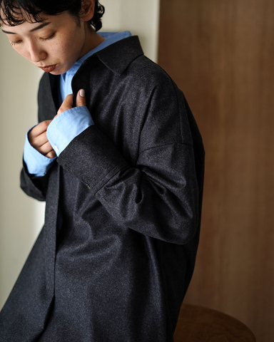上質なフラノ素材にカシミヤをブレンドした、仕立て映えのするシャツワンピース。高密度に織りあげた生地は程よいハリと柔らかさを備え、シンプルなシルエットを美しく引き立てます。