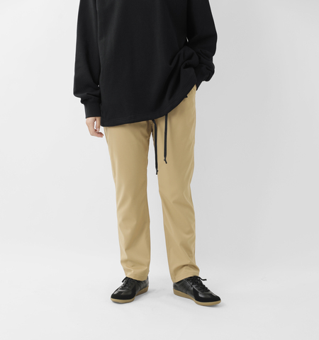 ストレッチギャバジンは、少し光沢感があり滑らかでドレープ性に優れており、サマーウールのようなサラっとした質感でシワになり難いのが特徴。ストレッチ性も抜群で、ノンストレスな着用感。ウエストの片手で調整できるウェビングベルトや、180度の開脚を可能にしたガゼットクロッチなど機能性に優れたディティールが魅力のアイテムです。