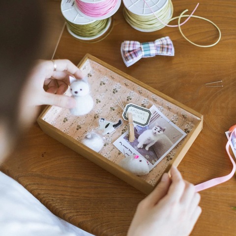 お気に入りの写真、毛玉、肉球スタンプ、使わななくなった首輪やおもちゃなどを配置すれば、自分だけの宝箱のようなスヴニールボックスが完成します。
