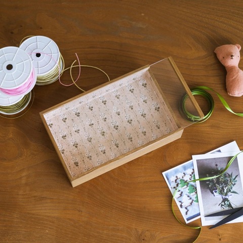 桐箱にレトロな壁紙風のペーパーを内貼りした、オルネコ・オリジナルのスヴニールボックス。スライド式の透明なフタ付きで、中身を眺めることができるディスプレイケースです。