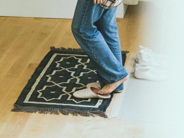 今回、日本の住まいにも取り入れやすいよう、少しコンパクトなサイズ感に仕立ててもらいました。 玄関やソファの前に敷くだけでも印象が変わりますが、ヨーロッパの家でよく見かけるように、廊下に沿わせてみるのもおすすめです。空間にリズムが出て、ぐっと引き締まります。
