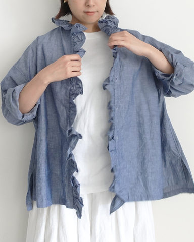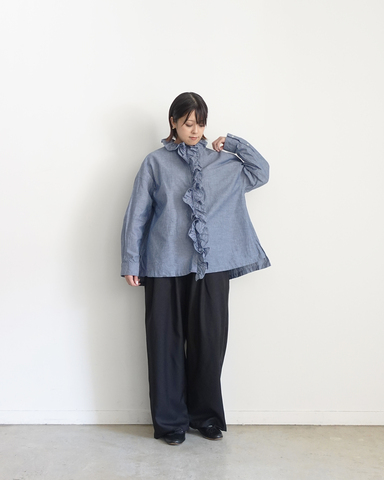 シンプルなアイテムと合わせやすいフリルシャツ。