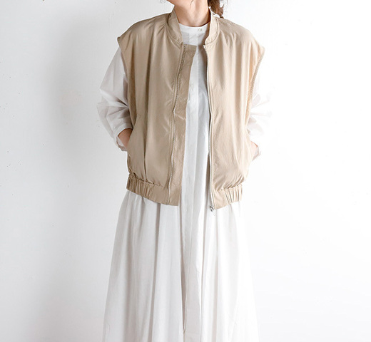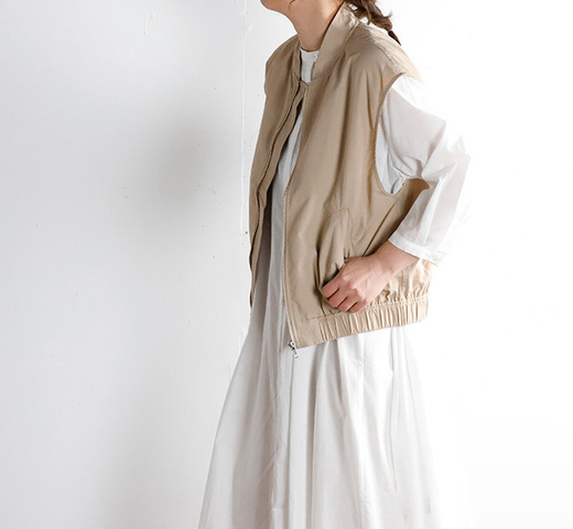カジュアルな着こなしを演出できるミリタリーベストです。フロントジップのスッキリ丈で気軽にレイヤードを楽しんでいただける1枚。ナイロン生地で軽さを感じていただけます。女性らしさも考えられた肩を包み込むフレンチ型のデザインもポイント。裾ゴムを使用しているのでフロントを閉めた時に腰にフィットしてくれます。色々なアイテムにレイヤードを楽しんでいただけるベストです。