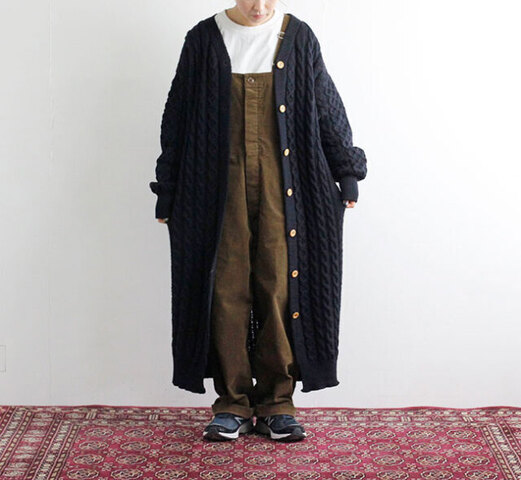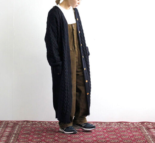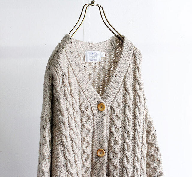 Kerry Woollen Millsより新作Vネックロングカーディガンが入荷しました。 ざっくりとしたアランケーブルのVネックロングカーディガン。 羽織りとしても、ワンピースとしても着れるので重宝します。 下ボタンの位置を少し高く設定しているため、締め付けがなくスリットが入っている感覚で着用できます。 様々なスタイリングに対応できる万能カーディガンです。