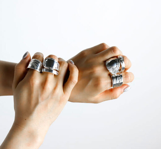 当時は親指にはめる指輪として使われていました。スプーンリングは70年代に復活し、現在も⾮常に⼈気があります。
