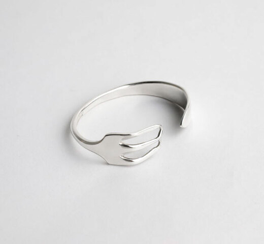 リサイクルされたた銀メッキのディナーフォークから⼿作業で作られています。。