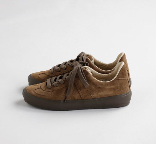 1980年代にかけてドイツ軍でトレーニングシューズとして採用されていたスニーカーの通称《ジャーマントレーナー》。 それをベースに軍用シューズを生産していたファクトリーに依頼し、現代的に再現しています。
