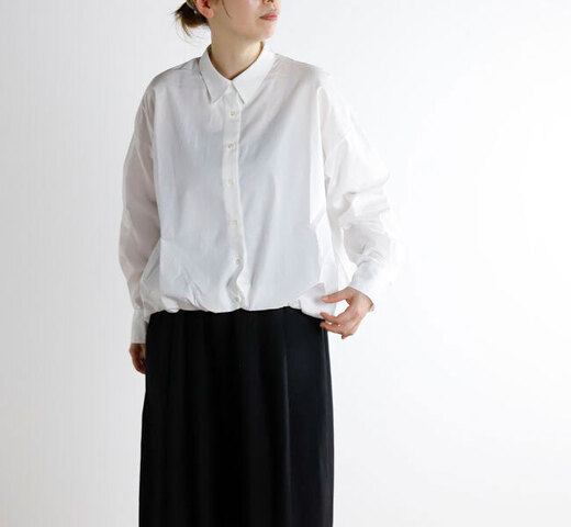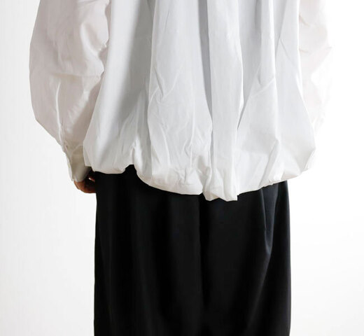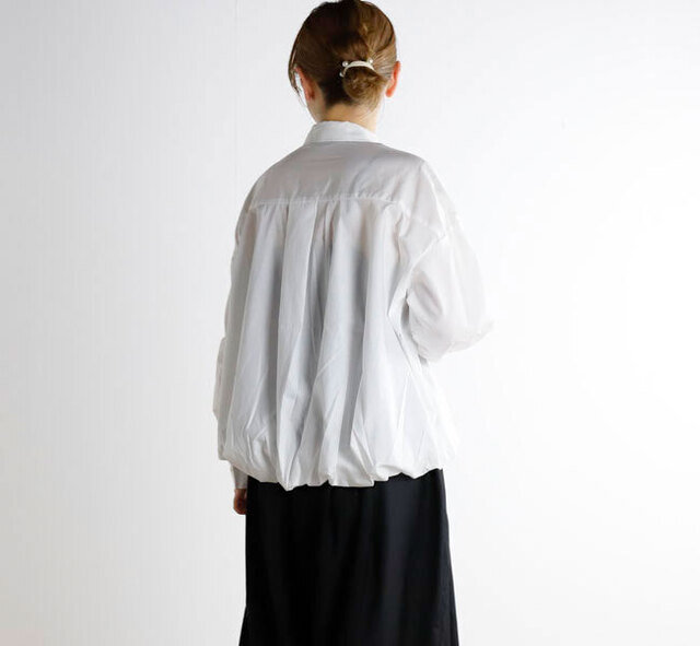 ベーシックなデザインにタックを施し、ふんわりとした丸みのあるバルーンシルエットに仕上げたシャツ。