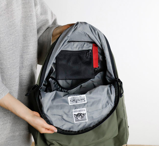 大型でありながら軽量さも追及した「 バックパック 」。丈夫で軽く、外側からの風雨を防ぐ防風・防水性と内側の湿度を外側に放出する透湿性を両立し、コットン60%ナイロン40%の比率からロクヨンともいわれる、クラシックなアウトドアアイテムの定番機能素材「 SIXTY FORTY FABRIC 」を採用。
