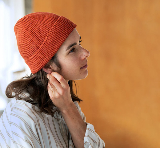 「ホールガーメント」という編み機で編み立てているので、縫い代のアタリがなく、頭の形に綺麗にフィット。無縫製のため裁断ロスを削減できるのもポイントです。