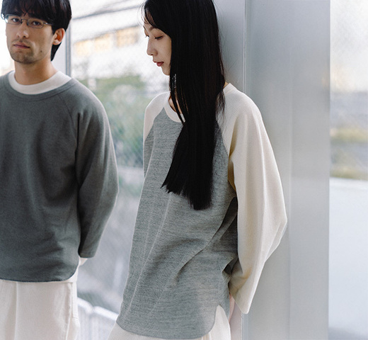 UNDYEDでは無染色(漂白→染色→柔軟をしない)で、原料本来の色をそのまま活用する事にこだわっています。 自然の柔らかの色合いはもちろん、染色加工を一切行っていない事で、生地本来の柔らかさも失わず素肌で着ても心地良い肌触りの生地に仕上がっています。 比較的薄手のワッフル素材なのでロンT感覚でご着用いただけます。