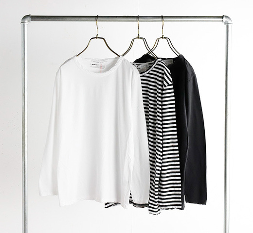 コットン100%素材のカットソーです。サラサラの肌触りと、丈夫な生地が特徴的な強撚天竺コットン。1枚ではもちろん、インナーとしても首元や裾から程よく見えるバランスの良いサイズ感です。長い季節お手にとって頂ける、着回しの利くカットソーです。
