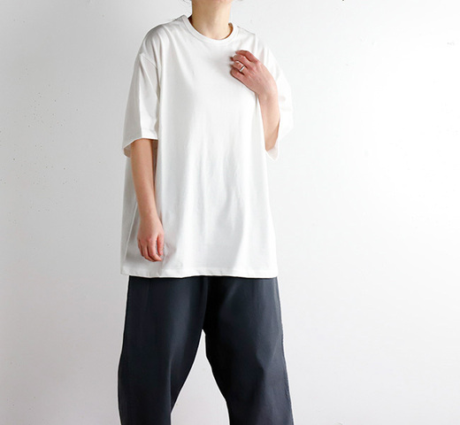 ショートスリーブTee。甘撚りの柔らかい糸をプレーティング編みし、更に特殊柔軟、バイオ加工を施しています。