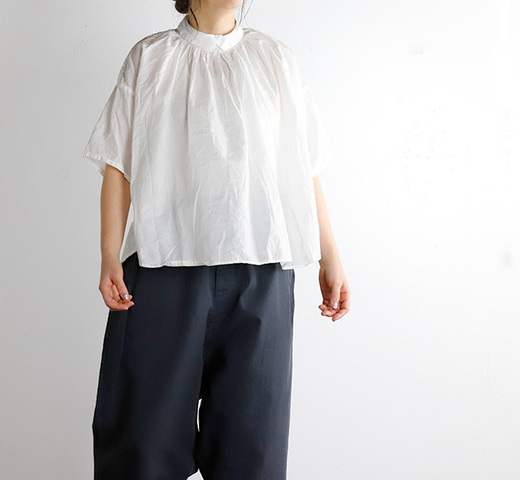 小ぶりな衿が華奢な印象に。ボタンを前にして着て頂く事も出来、様々なコーディネートをお楽しみ頂けるブラウスです。