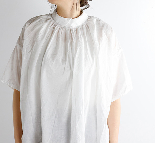 肘が隠れる長さの5分袖に変更。衿ぐりにたっぷりとギャザーを寄せたAラインシルエットです。