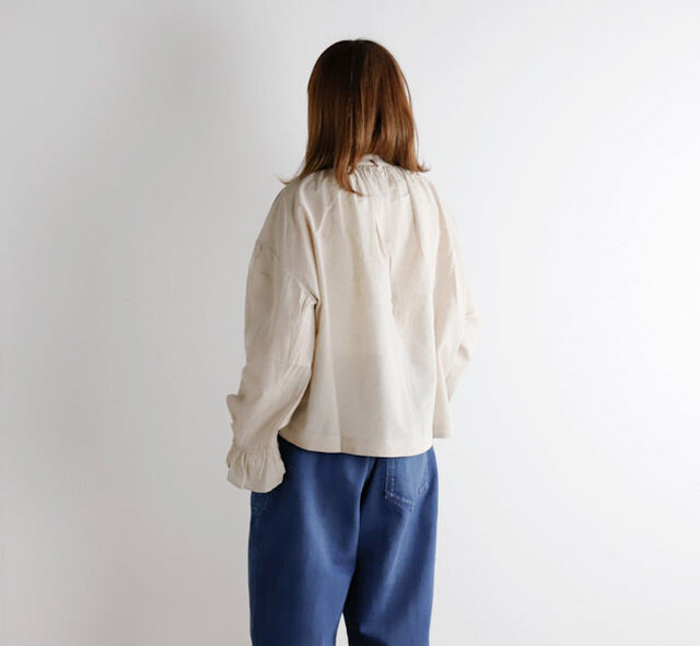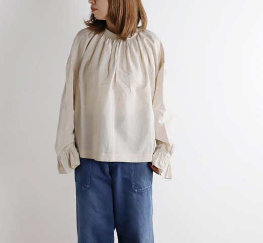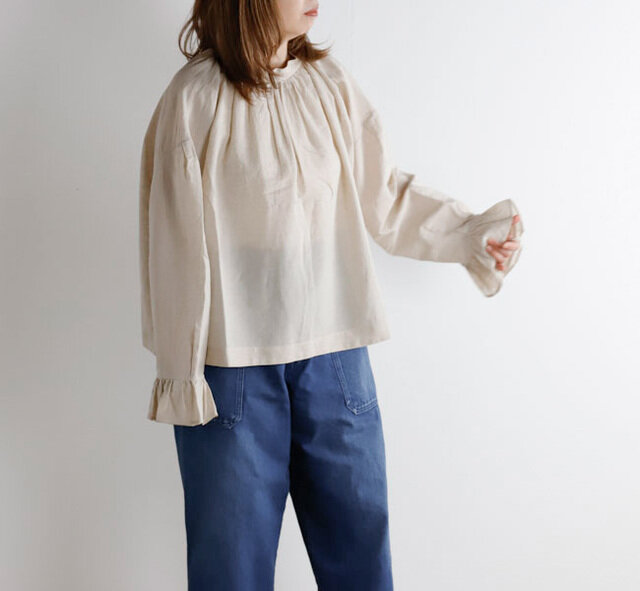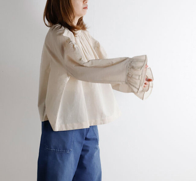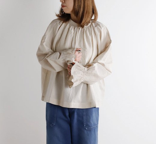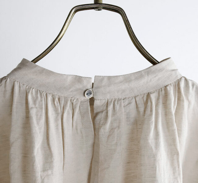 薄手で軽やかなコットンリネン素材を使用したブラウスです。オリジナルで製作した生地は、毛羽を焼いた光沢のあるコットン糸の上質さにリネン糸のシャリ感やナチュラルさを組み合わせた風合いが魅力です。