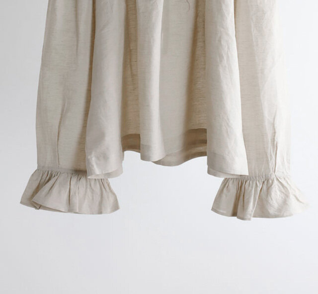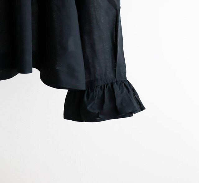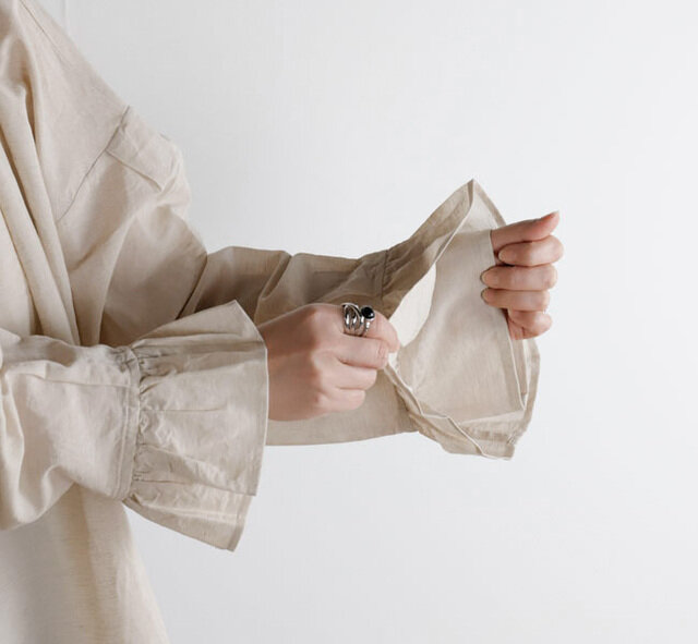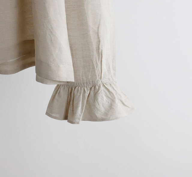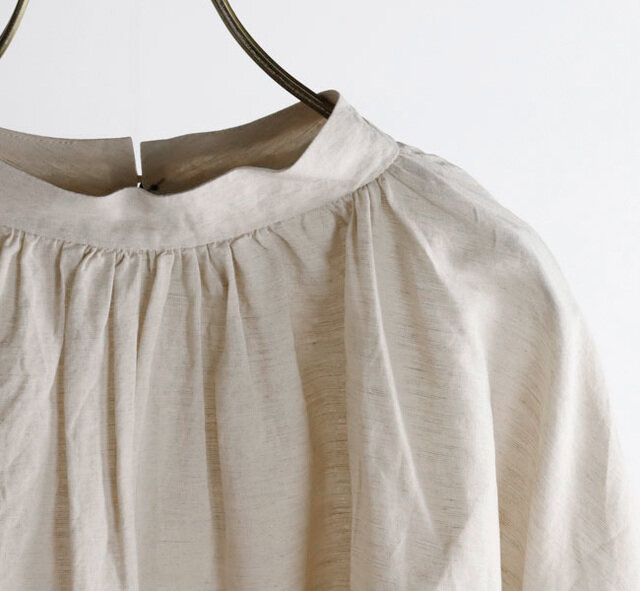 衿ぐりや袖口にたっぷりとギャザーを入れ、ふんわりと広がるAラインシルエットに仕上げてあります。