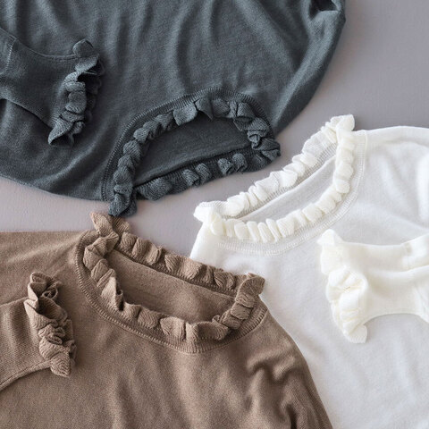 袖と裾に施された広めのリブがメリハリの効いたシルエットに。首元と袖口のフリルがほどよい甘さをプラスするので普段使いはもちろんのこと、装いにちょっと華やかさをプラスしたいときにも重宝します。ベストやアウターを重ねた際にもフリルが可愛らしいポイントになってくれますよ。