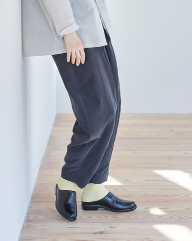裾に向かって細くなっていくシルエットですっきりとした印象ながら、股上は深く取りゆったりと。日常の動きを妨げない穿き心地です。