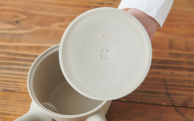 共茶漉しという、急須本体と同じ陶製で細かな穴を空けた仕様。一つ一つ、職人が手作業で穴を空けています。ステンレスの茶漉しは金気を感じることもありますが、共茶漉しでは、茶葉そのものの味を愉しんでいただけます。半球体の形に、穴が細かく空けられているため、茶葉が詰まりにくくスムーズに注げます。