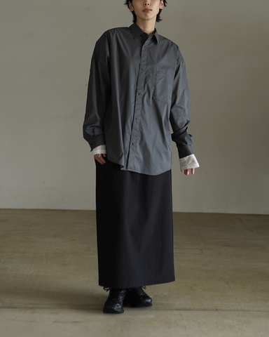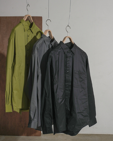 シルエットはややゆったりめで、フロントは着脱が容易な樹脂製ドットボタン仕様。左胸にはグラスホルダー付きポケットを配置し、機能性を高めています。