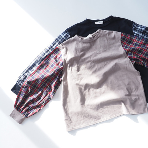 無地の身頃にタータンチェックのギャザースリーブを組み合わせた、異素材デザインのプルオーバーです。